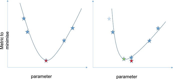 There are several factors which alter the contrast. The cell size, frequency, number of rendered points, linewidth, and also the gamma-like factor applied to the image before the linify. Images were then optimised by adjusting the gamma-like factor. Optimal values were found between ~0.75 and ~1.65. Higher values were better for darker images. Successive parabolic interpolation (SPI) was used, four values were selected at random, and their error with respect to the original image was found. These values were then used to fit a parabola, and the minima of the parabola were used as a new point. This process was iterated with the four best values being used for the fit. This process can be seen in the figures below. In the first figure, four points (the blue stars) are found. The first parabola is fitted, and the red point is the predicted best parameter value. In the second figure, the blue star shows the true value of the metric we are trying to minimise, it is slightly different than predicted. A new estimated best parameter value (green) is found. And so on. To ensure that the parabola is only used near the minima of the function, the points farthest from the minima are discarded. Typically, only three points are used, my implementation uses four for robustness, which is helpful as the curve is non-analytic and non-smooth.