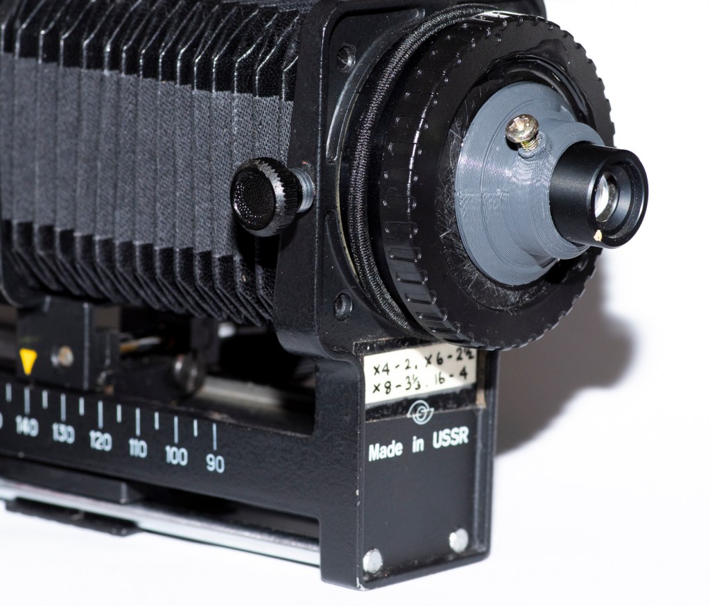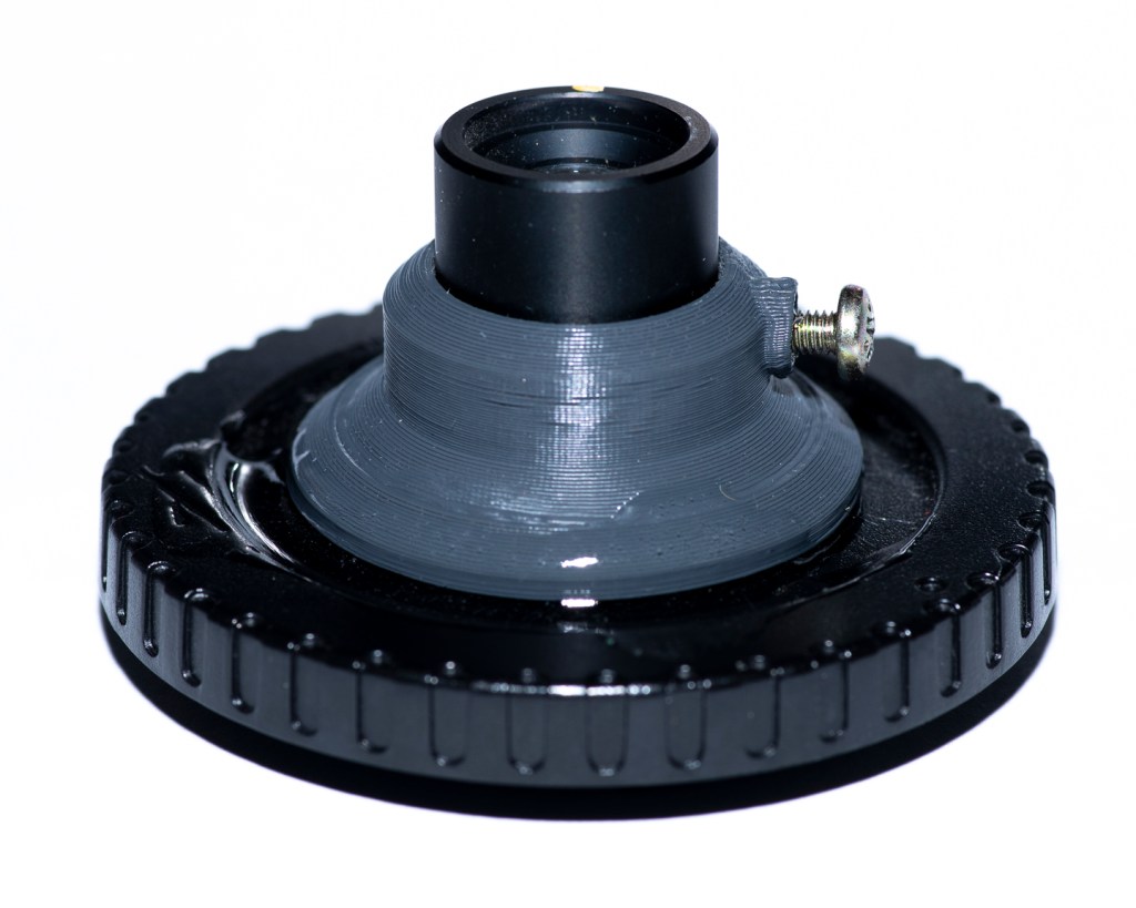 In order to mount the lens securely, I designed a small device to securely hold the lens. The bore has 0.5mm of clearance for the lens barrel, and a flange at the base so that the lens can be reliably positioned the same distance from the sensor. This was 3D printed by a friend of mine. There is also a place for a grub screw to be installed so as to secure the lens in place. The base is so sized so that it may be bonded to a body cap. The injection moulding used on the body cap left the inside surface shiny, this was sanded to reduce reflections. The body cap can the be fitted to a set of bellows or extension tubes.