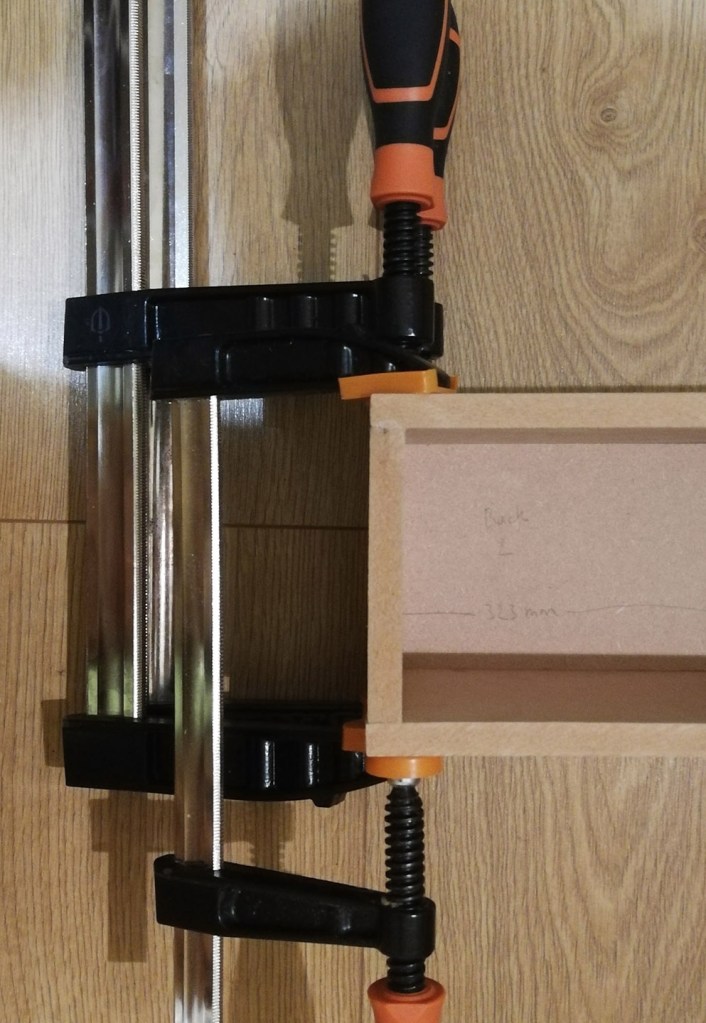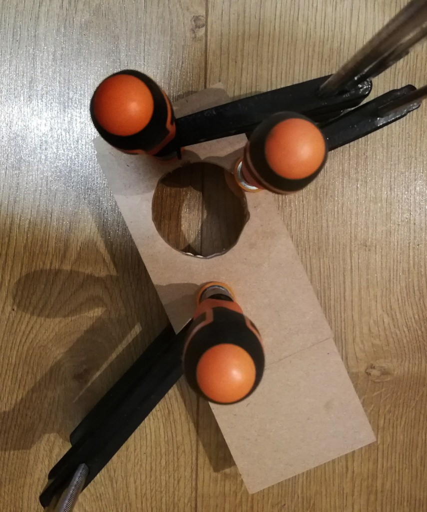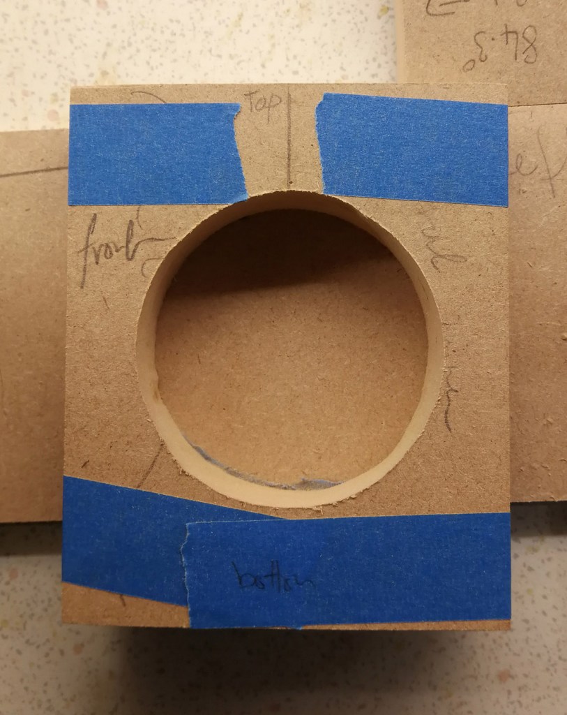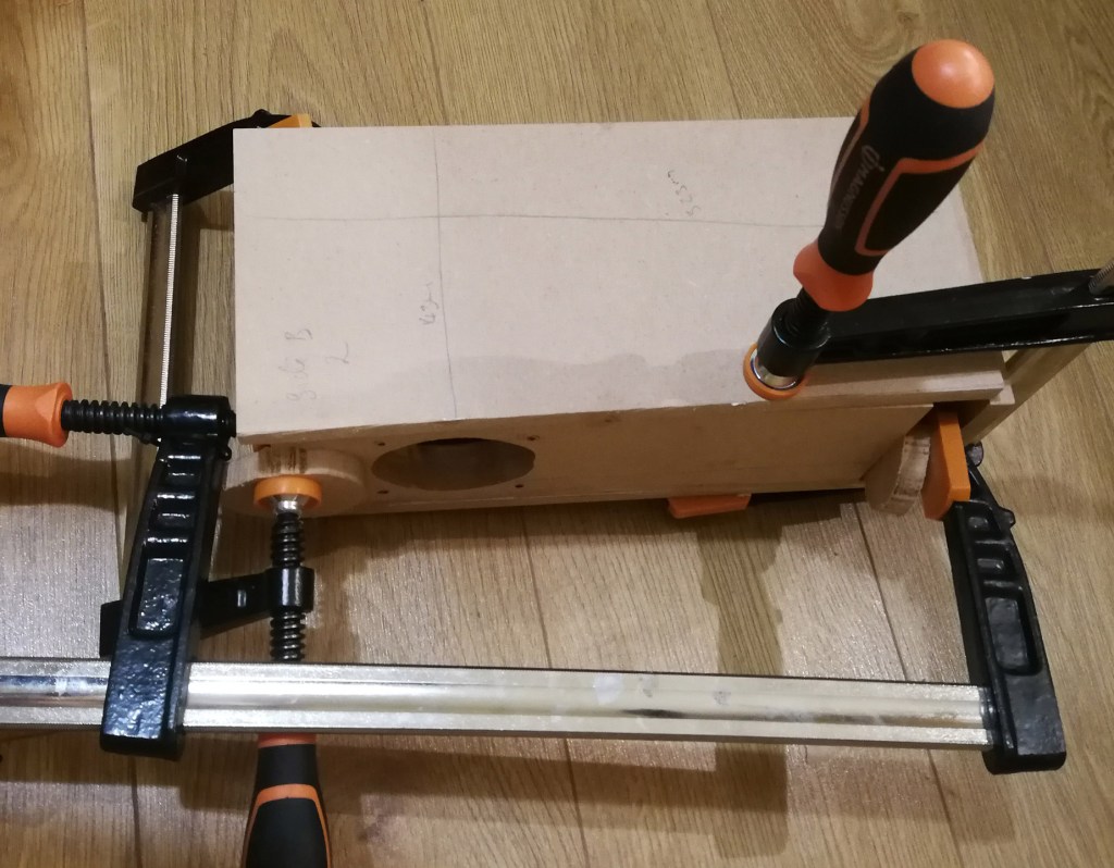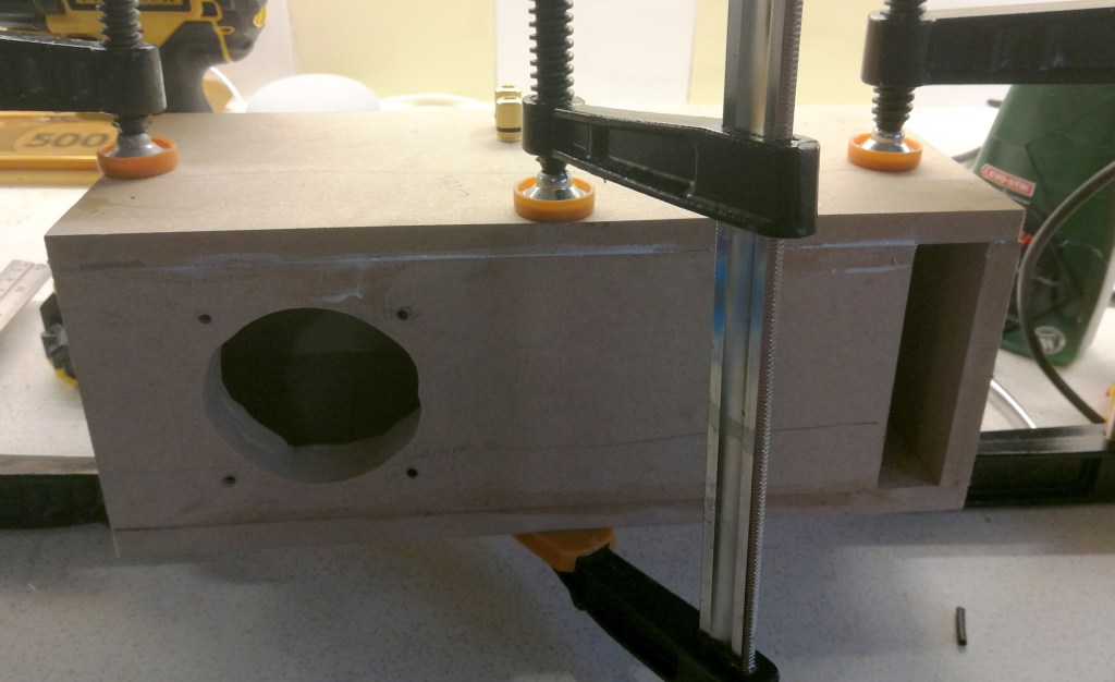 Each of the components were glued on to one of the side panels. 3D printed spacer cubes were used to hold the components of the port the correct distance away from one another. These were strong enough to clamp over and were printed very slowly so as to ensure they were dimensionally accurate. Clamps and weights (including a blender full of water) were used to hold everything together. Only one or two parts of the speaker were glued at each step, other parts were dry fitted in place to ensure everything stayed in position. Aluminium foil was used to separate surfaces that shouldn’t be glued.