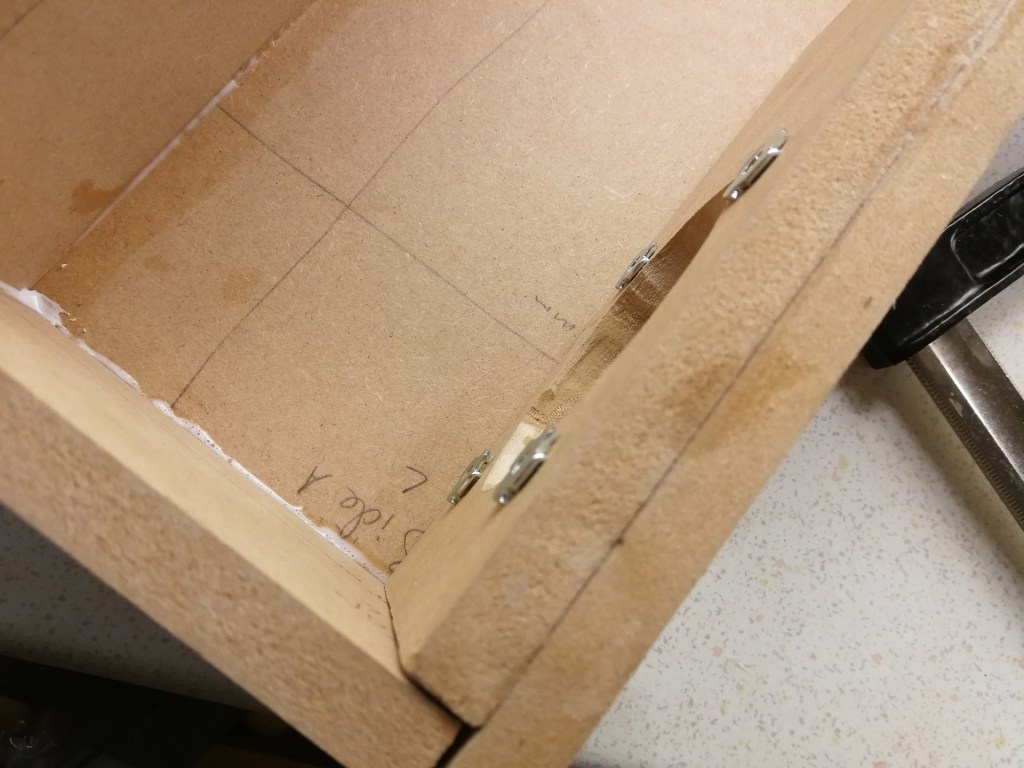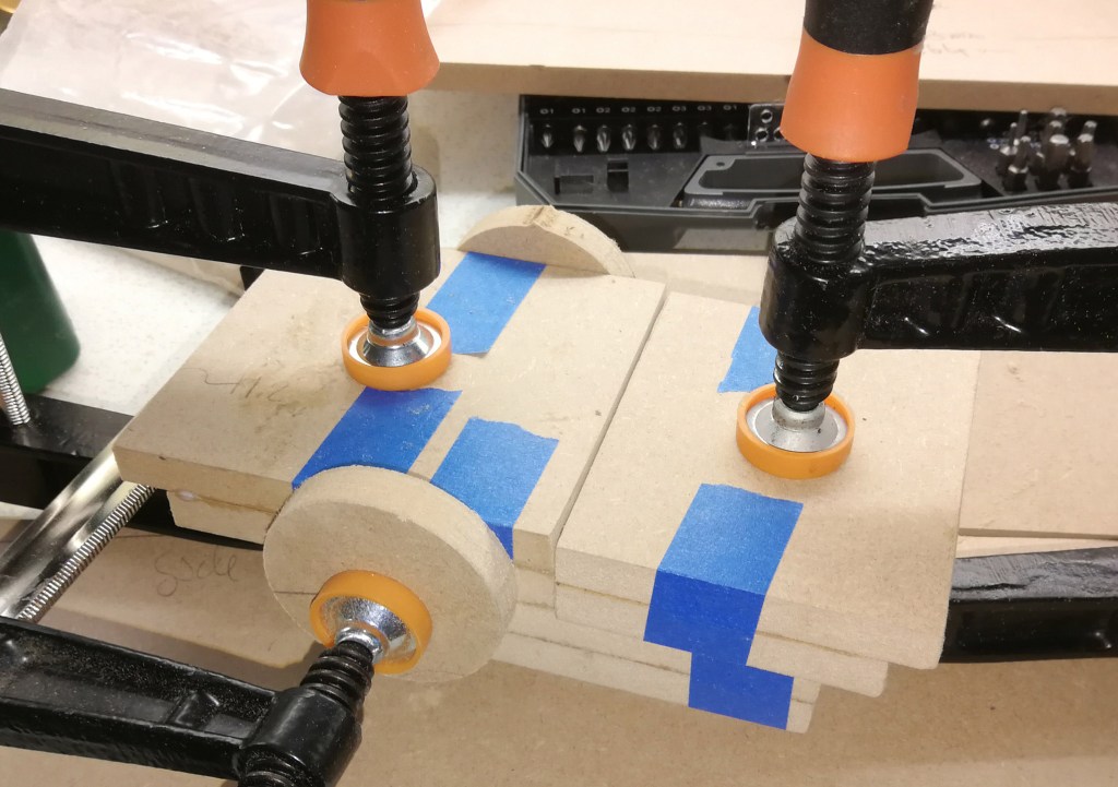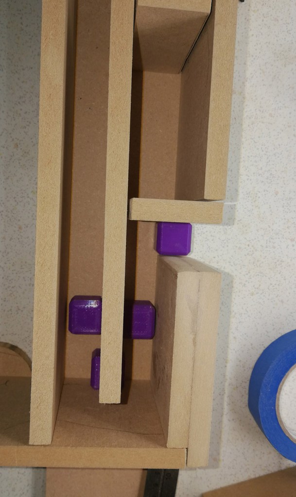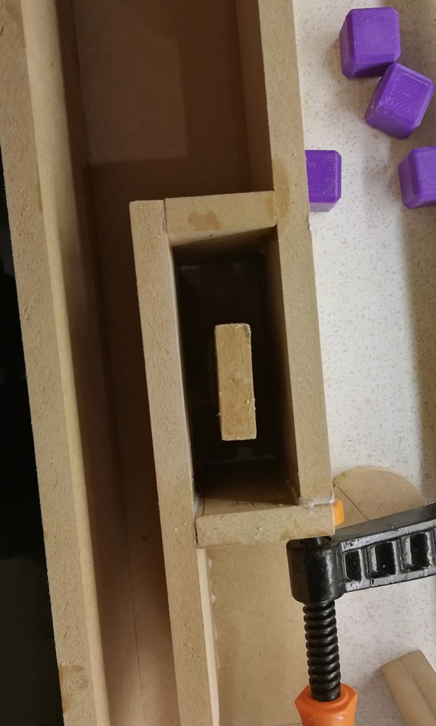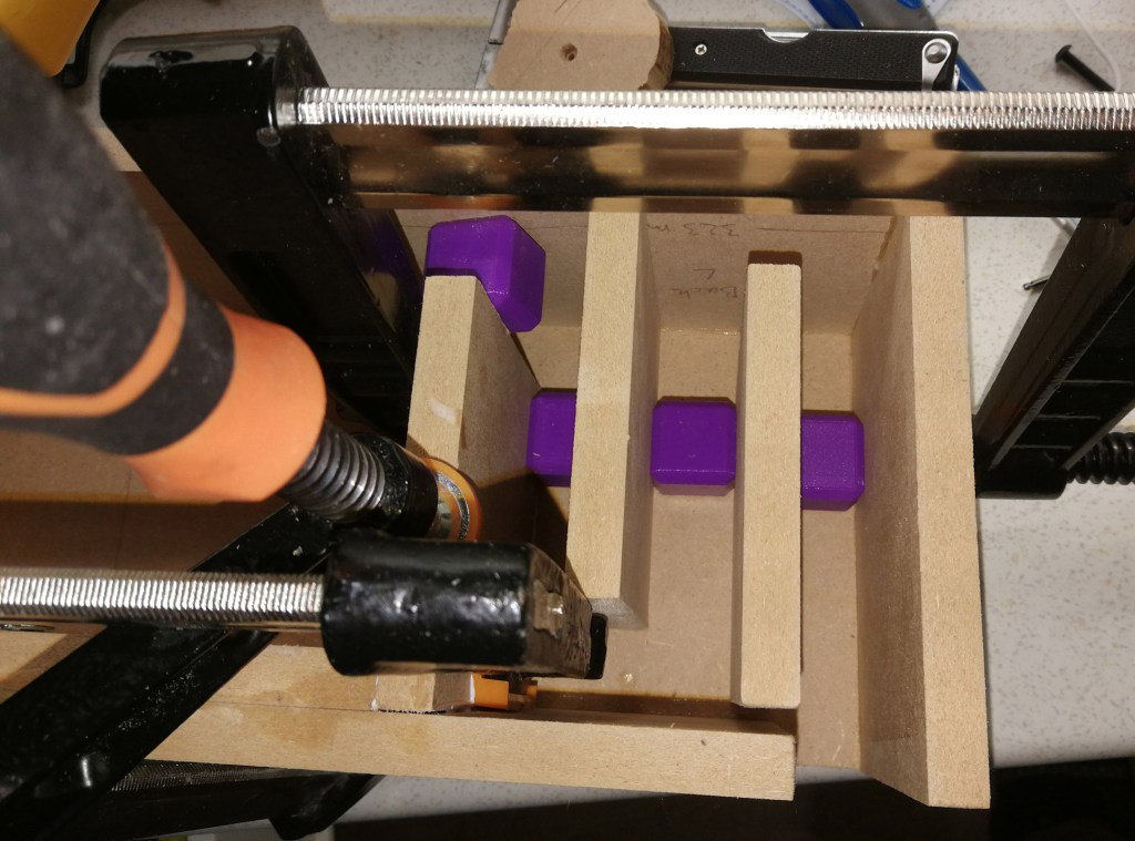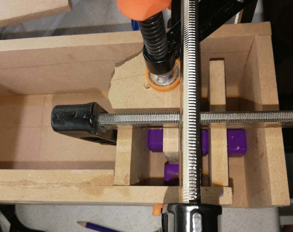 Each of the components were glued on to one of the side panels. 3D printed spacer cubes were used to hold the components of the port the correct distance away from one another. These were strong enough to clamp over and were printed very slowly so as to ensure they were dimensionally accurate. Clamps and weights (including a blender full of water) were used to hold everything together. Only one or two parts of the speaker were glued at each step, other parts were dry fitted in place to ensure everything stayed in position. Aluminium foil was used to separate surfaces that shouldn’t be glued.