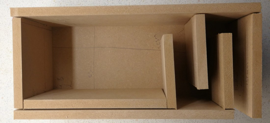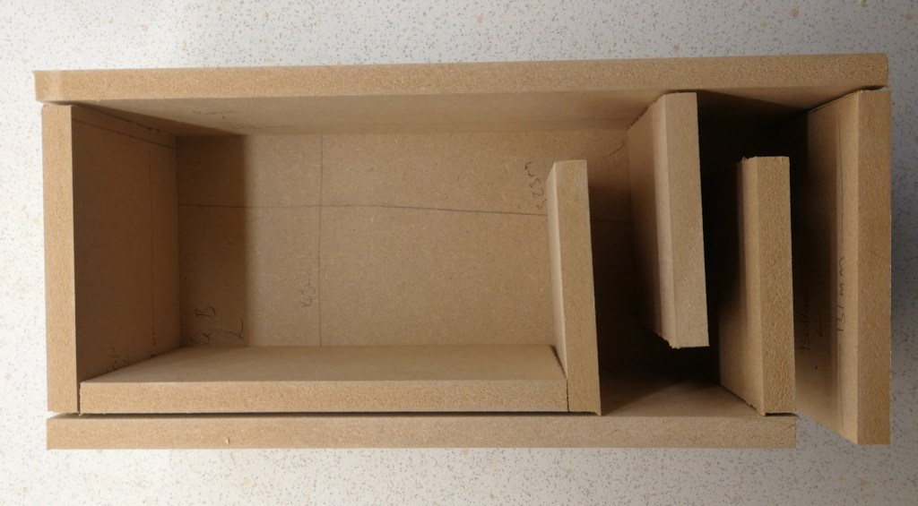 Designing a box of the correct volume is easy enough, working out the correct port length was a little more challenging, but for a folded port it is easy to use some algebra to work out how many turns to use. To make sure the speaker was stiff enough everything was made from 12mm MDF (although I understand that plywood would have been a better choice as it is stiffer for the same thickness), and the front baffle was made double thickness. The top of the angled speaker was also made twice as thick to reduce the radiated sound. The sharp angles in the port will cause turbulence and reduce the efficiency of the port – I assume it was also reduce the Q of the port resonance (which should increase the tolerance in port length).
