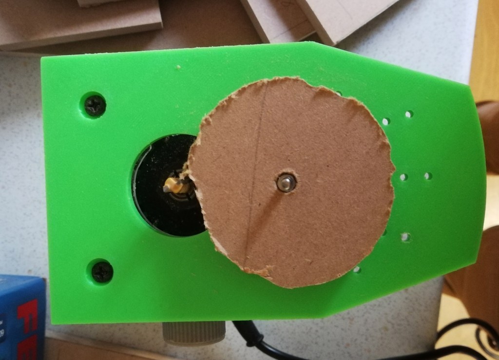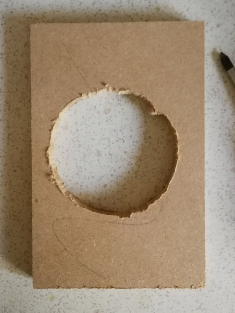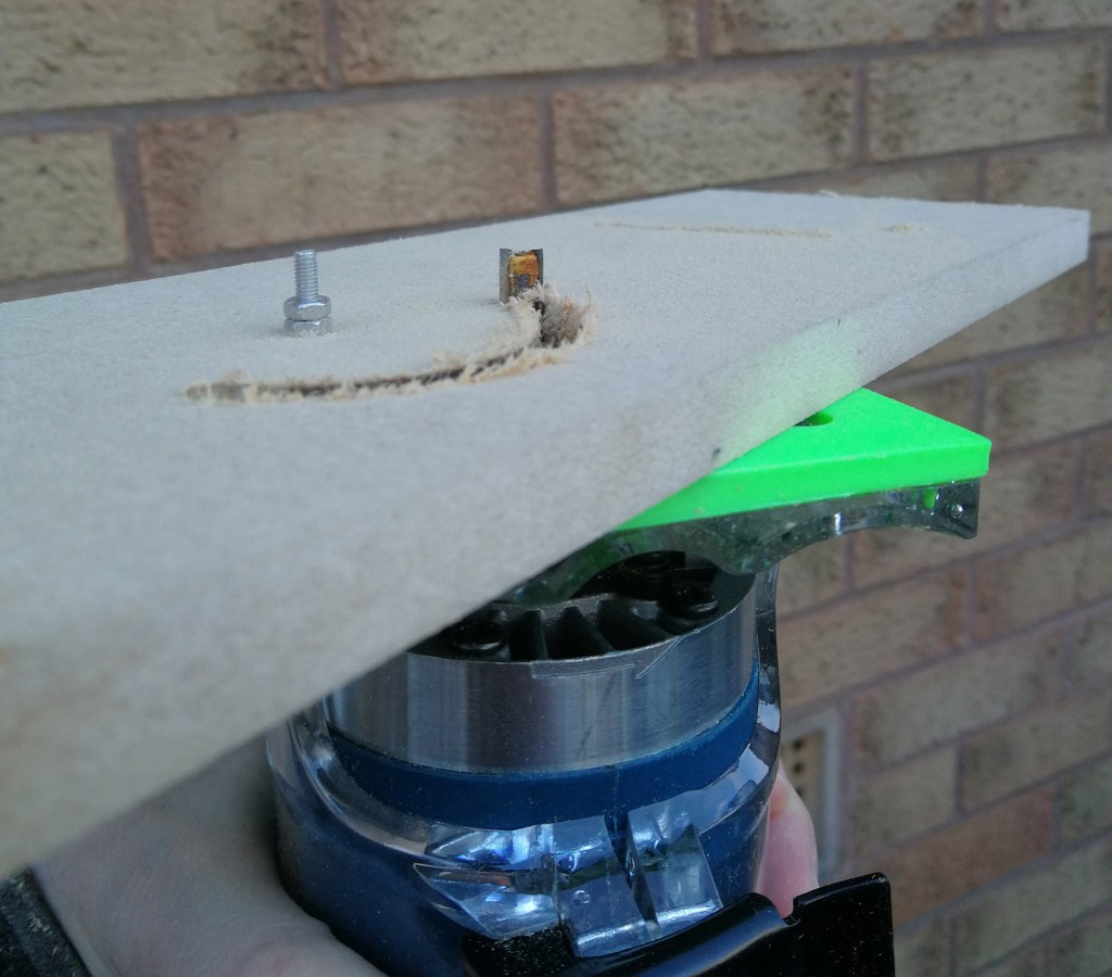 I 3D printed a circle cutting jig for my router in order to cut the 3” hole for the driver; an M3 machine screw holds the jig to the wood and sets the radius. For small holes the order of operations is a little awkward as the screw head is under the body of the router. Rather disconcertingly when in use the last part of the circle is quite hard to cut as the wood is only joined by a thin section. I drilled the centre holes for the speaker cut outs with the two piece of wood taped together, however, the router bit was not long enough to cut through both piece of wood, so they were separated for the final hole. I cut the hole undersized for the driver, and, after gluing together both components, I widened the hole with a rotary tool to make room for the basket and terminals.