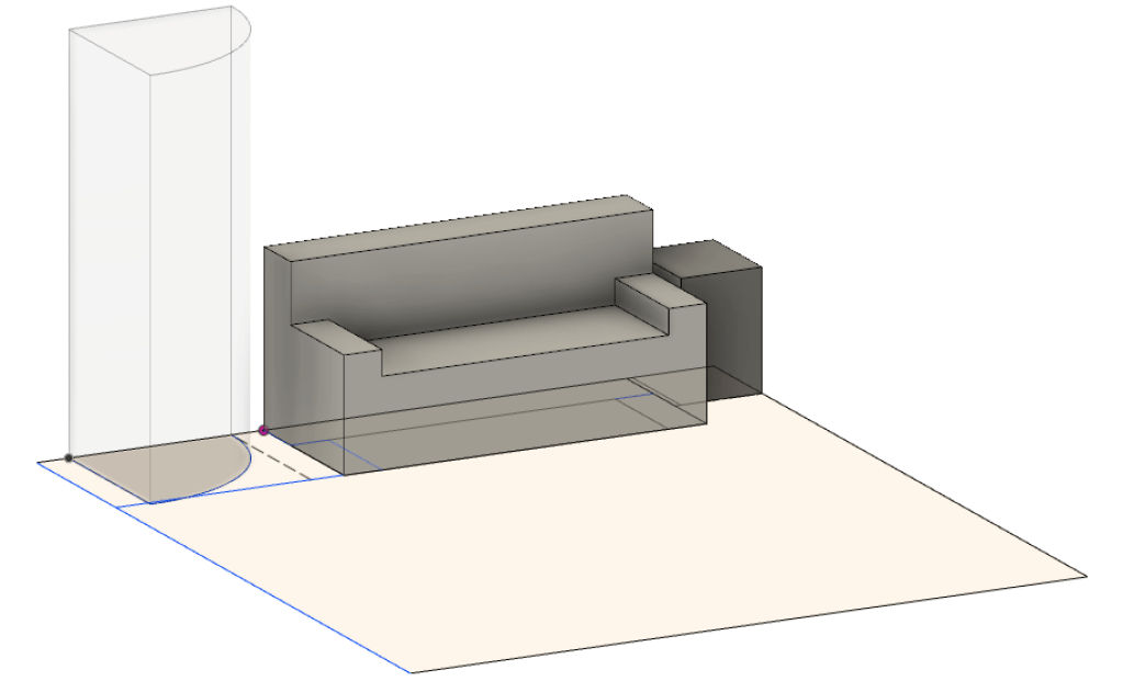With this idea in mind, I took some measurements of the distances and hight of the seating position, location of sofa, etc and put this geometry into Fusion 360 – a CAD software. This allowed for easy determination of the correct height and angle for the speaker driver to be located, such that a reflection off of the wall would arrive at approximately ear level.