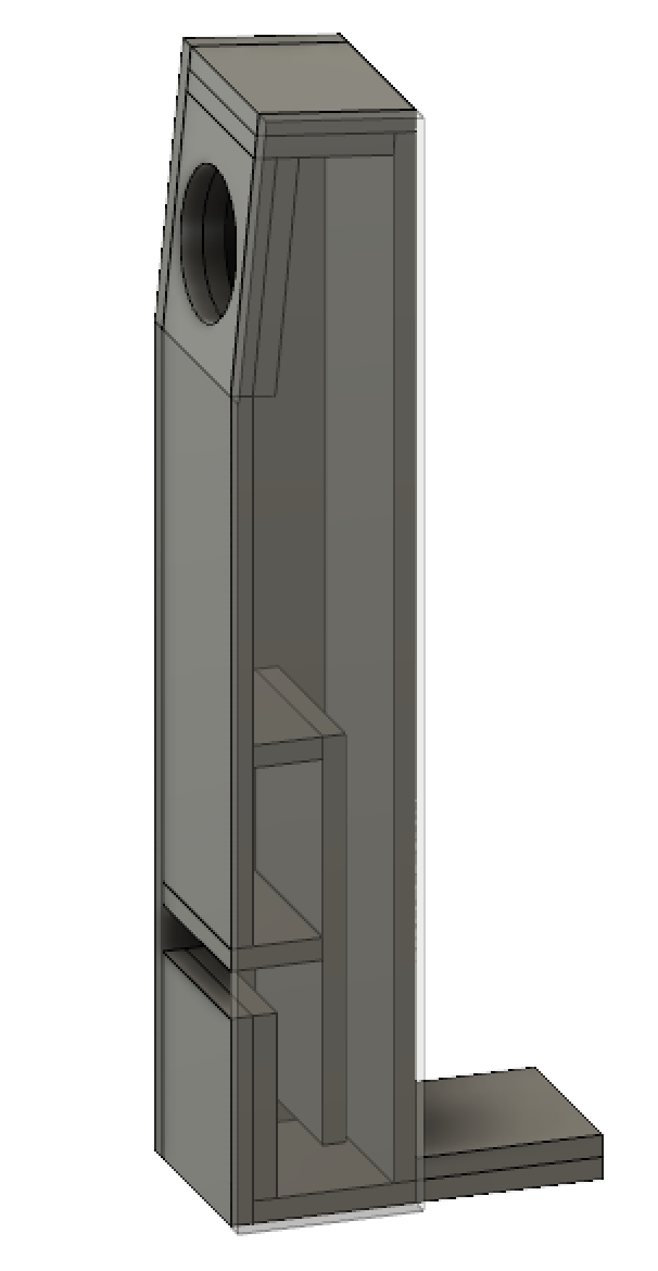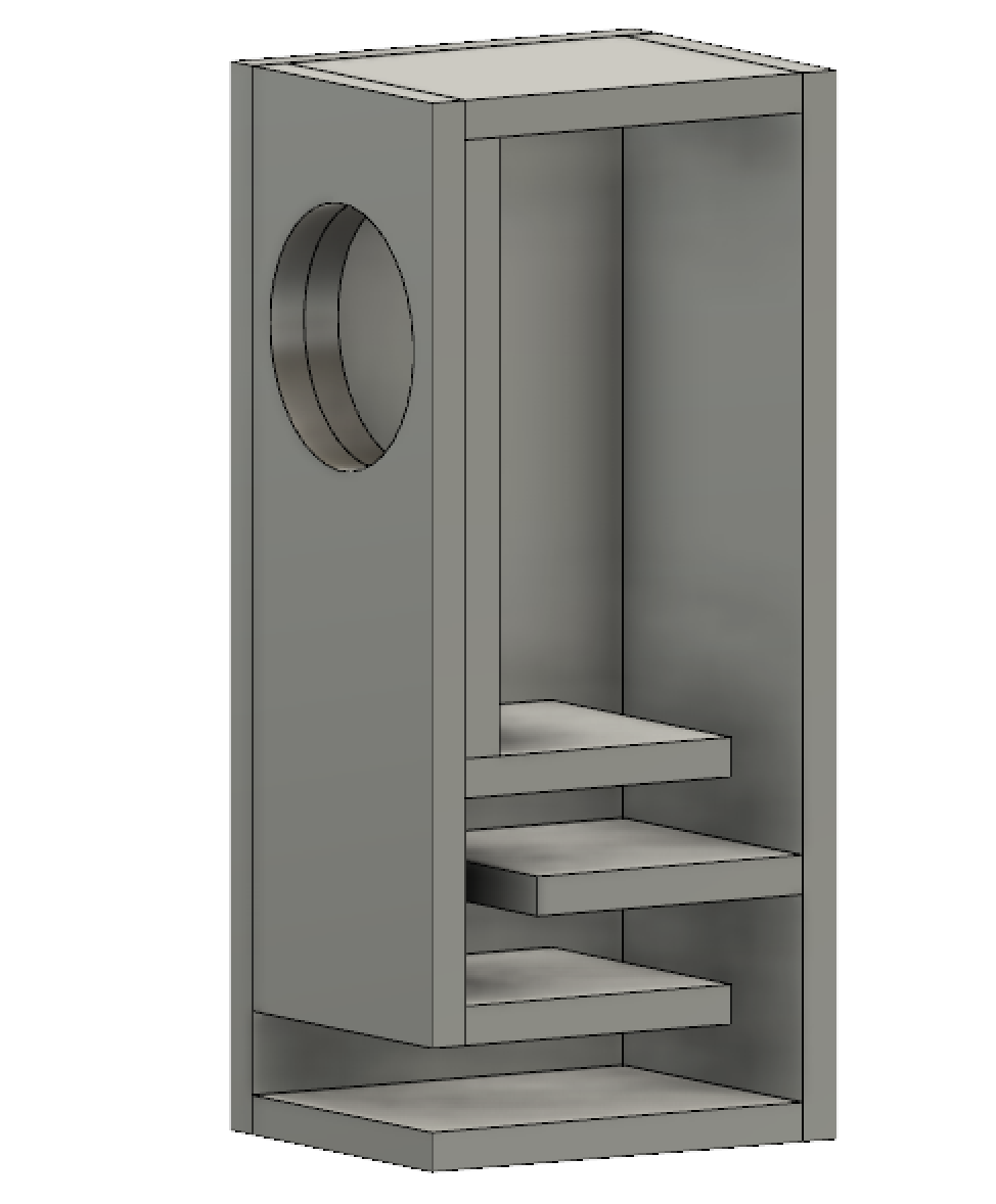 The final parameters for the ported box was a volume of 2L, a rectangular port of 4″x 1″ and 40.6cm long. With these parameters I then went back to Fusion 360 to design the boxes. I designed two completely different boxes that both have the same port length and volume. The first of which was a traditional bookshelf speaker form, with a front facing port. The driver height was set to be just above ear level. The second box was designed with the speaker driver angled at 5.7˚ above horizontal, and a plate such that it can be stabilised under a sofa. The second box was also much taller, just under the height of the arm of the sofa.