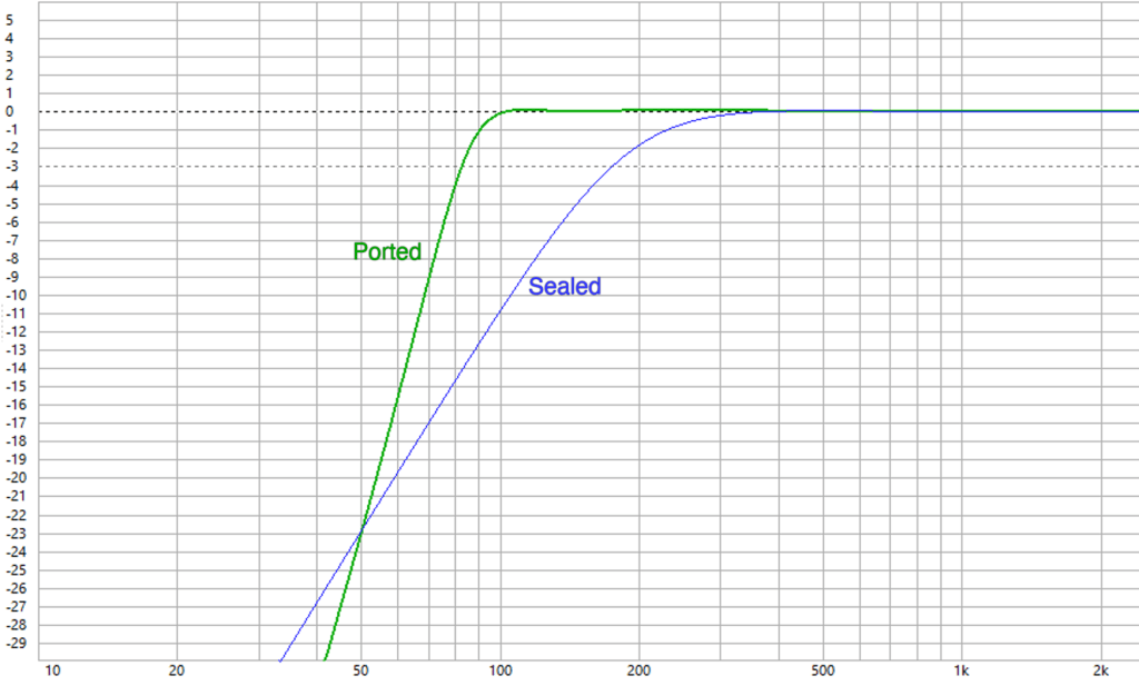 Comparison of a ported and sealed enclosure response in WinISD. The ported response has a higher -3dB point, but the response drops of more rapidly. The sealed box has a volume of 0.7L. The ported box has a volume of 2L and a 4″x1″ port that is 40.6cm long.