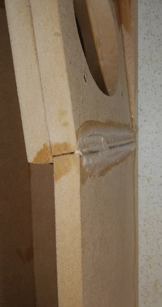 I lightly sanded various parts of the speakers for fitting. The 5.7˚ angle for the angled speaker baffle was sanded into the front panel. And other parts were sanded flat to remove saw marks before gluing. The dust from this was collected and mixed with glue to make a wood filler that was used to fill the gaps made by my imperfect joinery. This filler was used inside and out of both speakers before the side panel was finally attached.