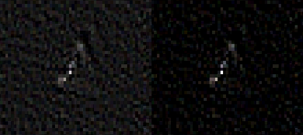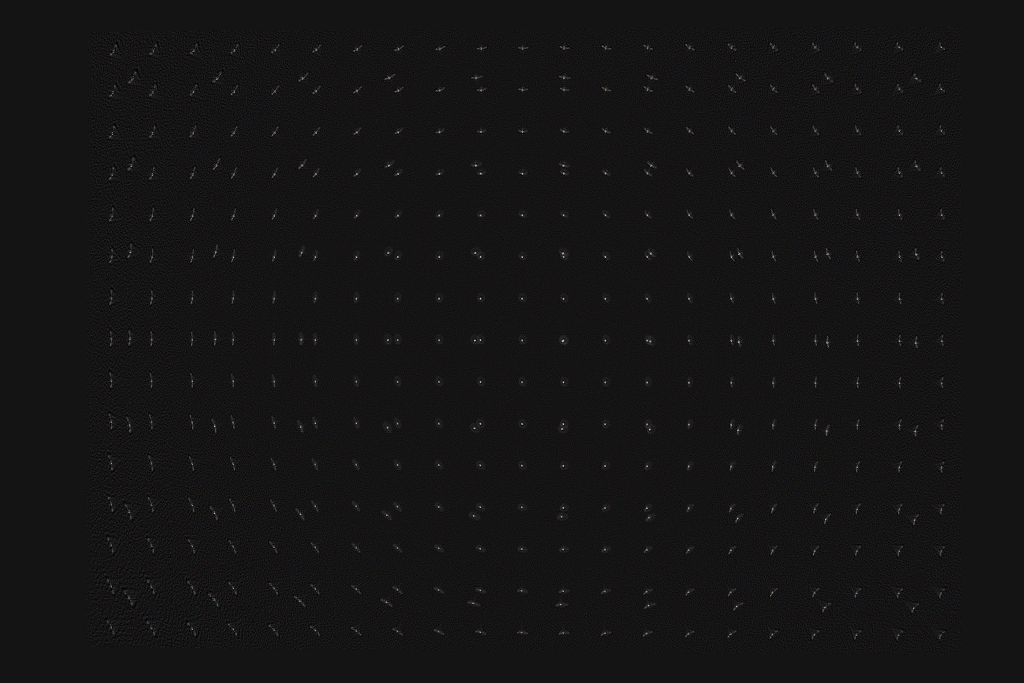 Enlarged examples of the test target pairs are shown in Figure 3. I then worked out exactly what blurring function you need to apply to the sharp image to produce the blurred image for each pair of targets. The result of this is shown in Figure 4, which is an array of point spread functions (PSFs). These PSFs show how each point in the image is blurred by the lens – the PSFs in Figure 4 are zoomed in 7x. Figure 4 also includes a second array of targets that is offset from the one shown in Figures 1 and 2, that’s why the PSFs are arranged in two grid patterns. The results from the two test charts agree.