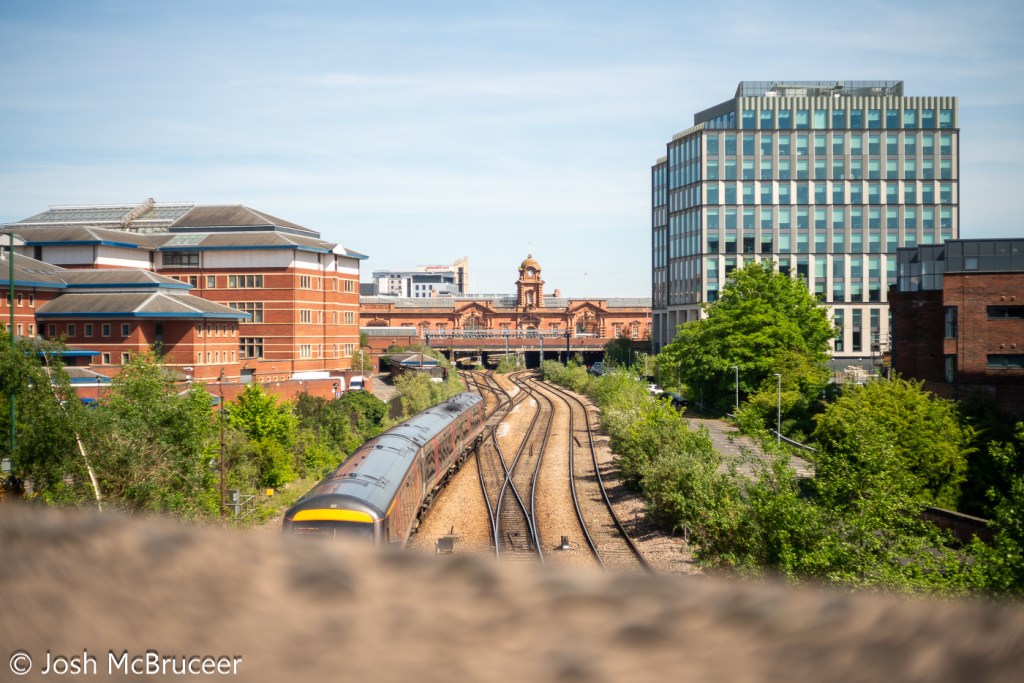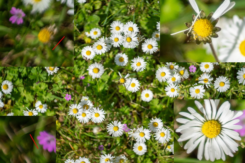 A selected sample of images with zoomed-in regions. The image with daisies shows much greater sharpness in the centre of the image compared with the edge and some swirling effect caused by the astigmatism in the lens. The pair of images of the graffiti rabbit (f/2.8 and f/8) show the increase in contrast and sharpness as the lens is stopped down. All areas of the image show an improvement in sharpness and contrast, but the edges improve more. This is also shown in the pair of leaf images, however, the increase in depth of field in these images makes it harder to determine sharpness changes in the plane of focus. The train track images show the same trend with a distinct increase in contrast in the centre of the image (the clocktower).