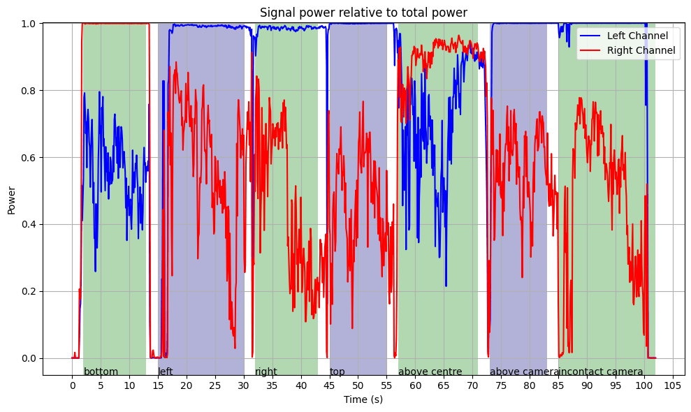 I moved the source around different parts of my phone and plotted the power in the FM carrier band. After looking at the plot, it became immediately obvious why the beam-forming algorithm never worked: the sound was far too directional. (This makes complete sense, given that it was a high-frequency sound.) There was never a point where the sound was picked up strongly by both microphones; it was only ever picked up by one at a time. I should have used a much simpler approach: just take the output from whichever channel had the highest power in the carrier band—a single line of code—rather than hundreds.