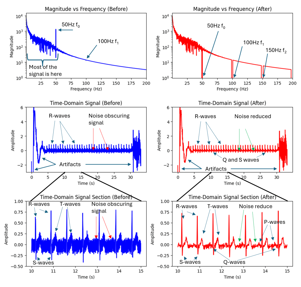 • Identify and filter out mains hum (e.g., 50 Hz in the UK, including harmonics). I implemented an adaptive Fourier-based filter to detect and remove the specific mains frequency and its harmonics.